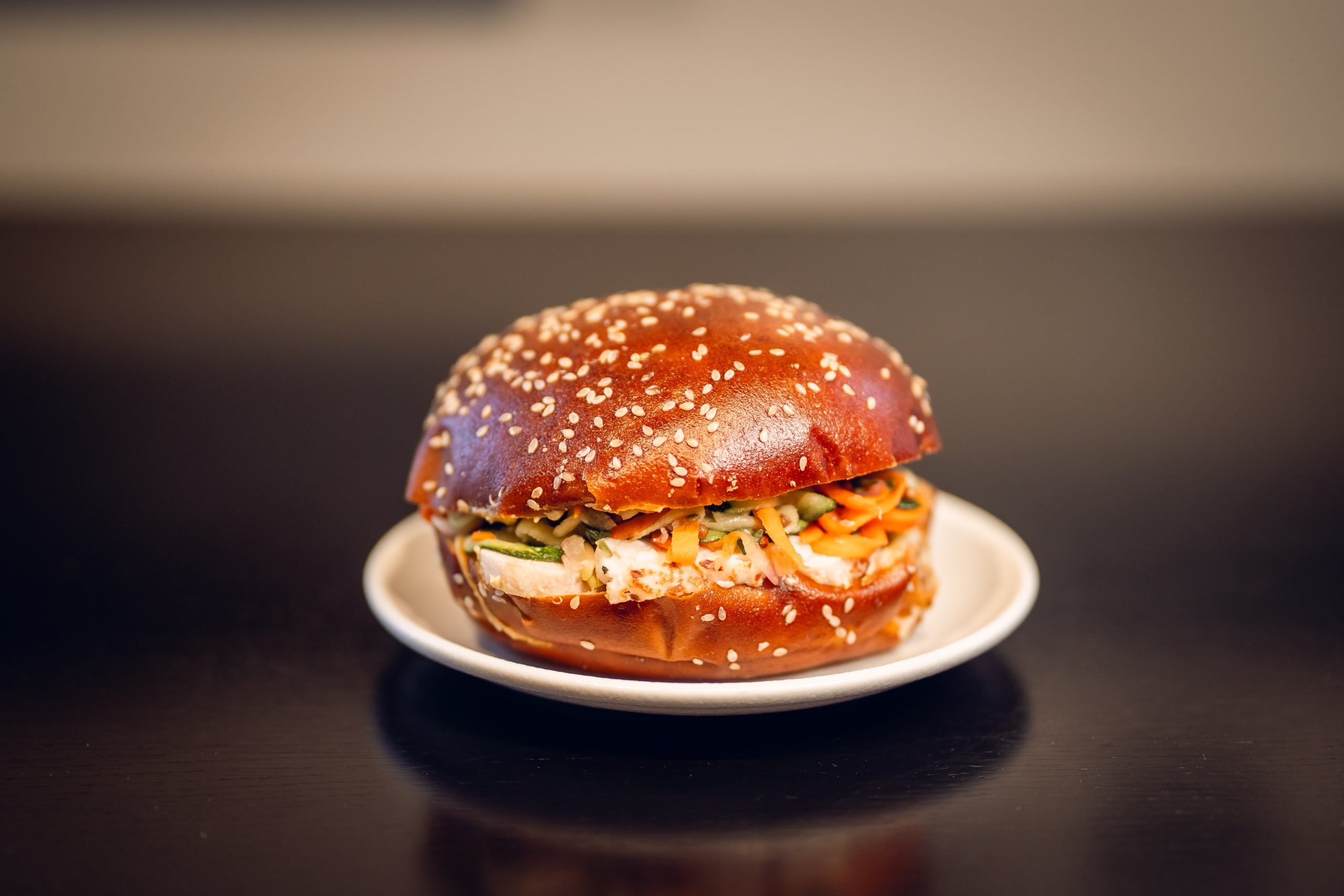 Pretzel maize ar sezama sēklām, pildīta ar sulīgu ceptu vistas fileju, svaigiem gurķiem, burkāniem, cukini un sarkano sīpolu. Papildināta ar aromātisku dārzeņu mērci un svaigu zaļumu notīm. Tā būs lieliska izvēle pusdienām ikdienas skrējienā.
